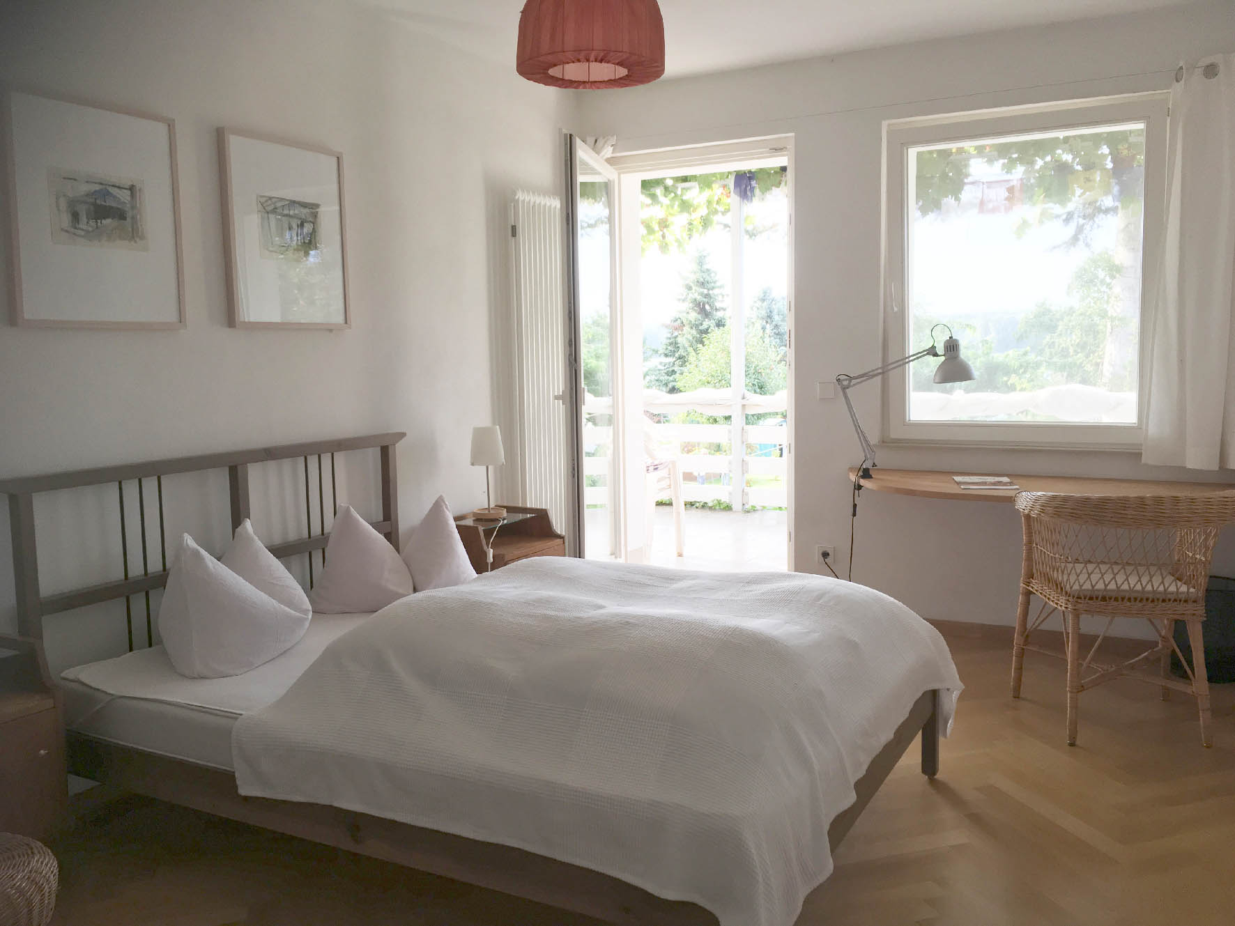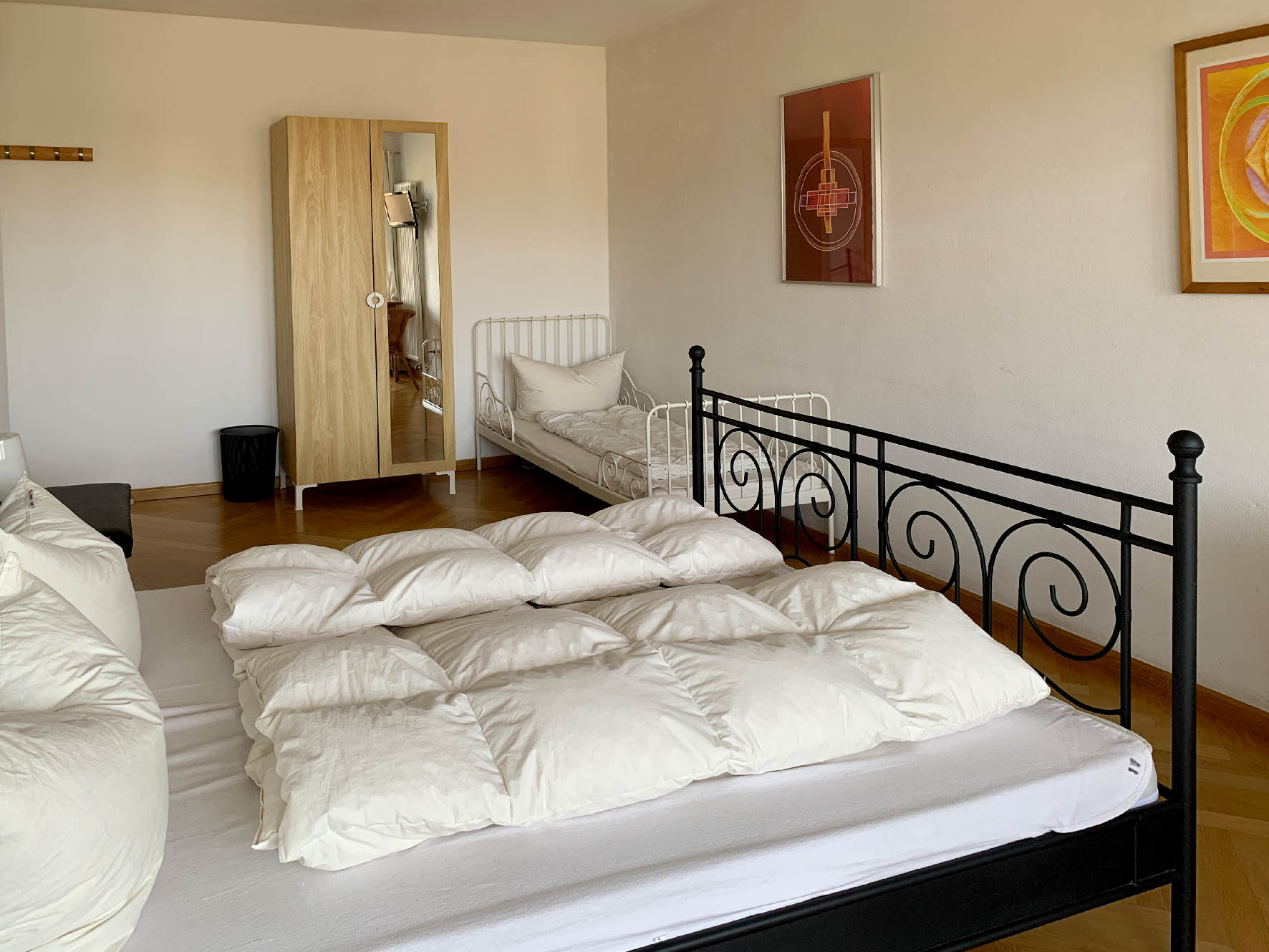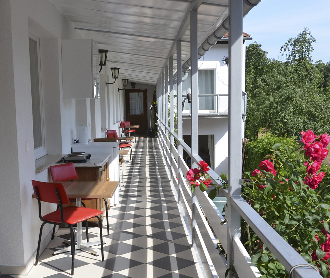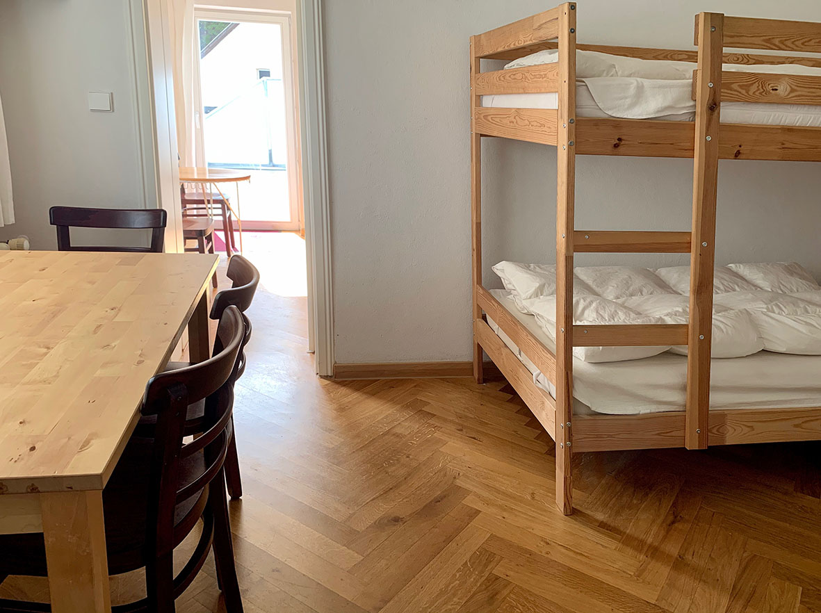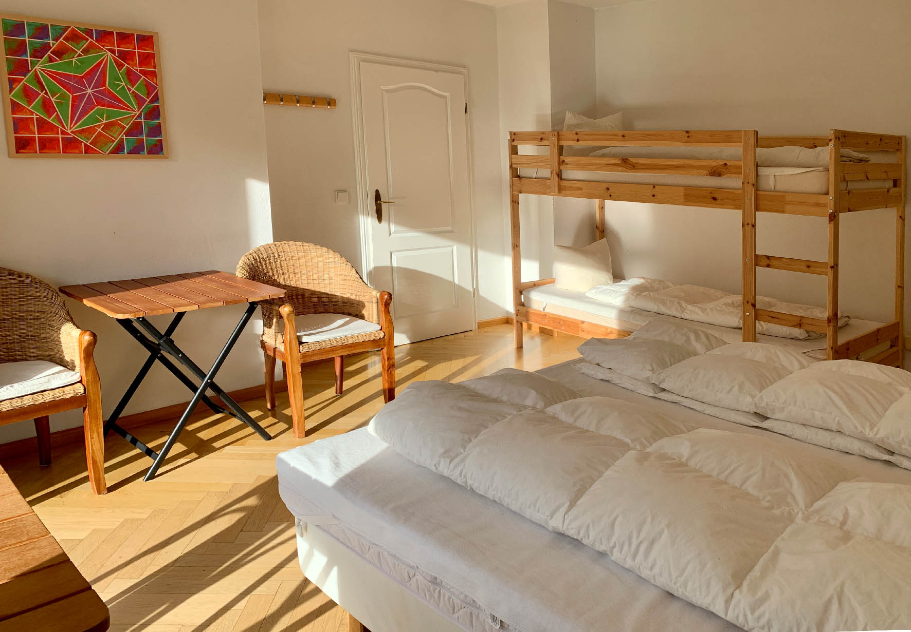 The „Courtyard Balcony Room“ (Hofbalkonzimmer) and the "Lake View Rooms" are located on the upper floor, with shared kitchen and bathroom, and has a private balcony to enjoy the morning sun overlooking the courtyard. It has two beds and a bunk bed (mattress : 90 cm x 2 m).