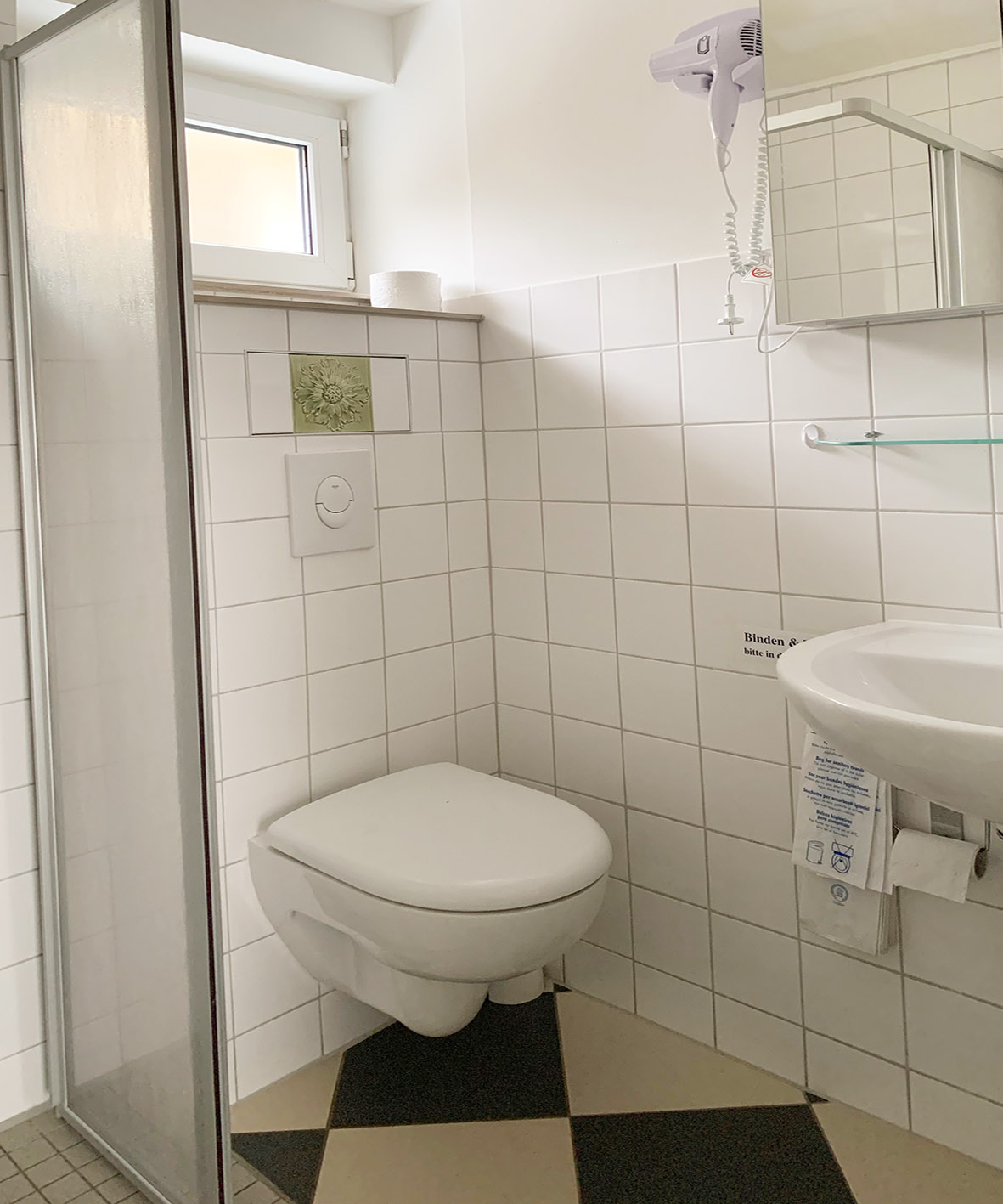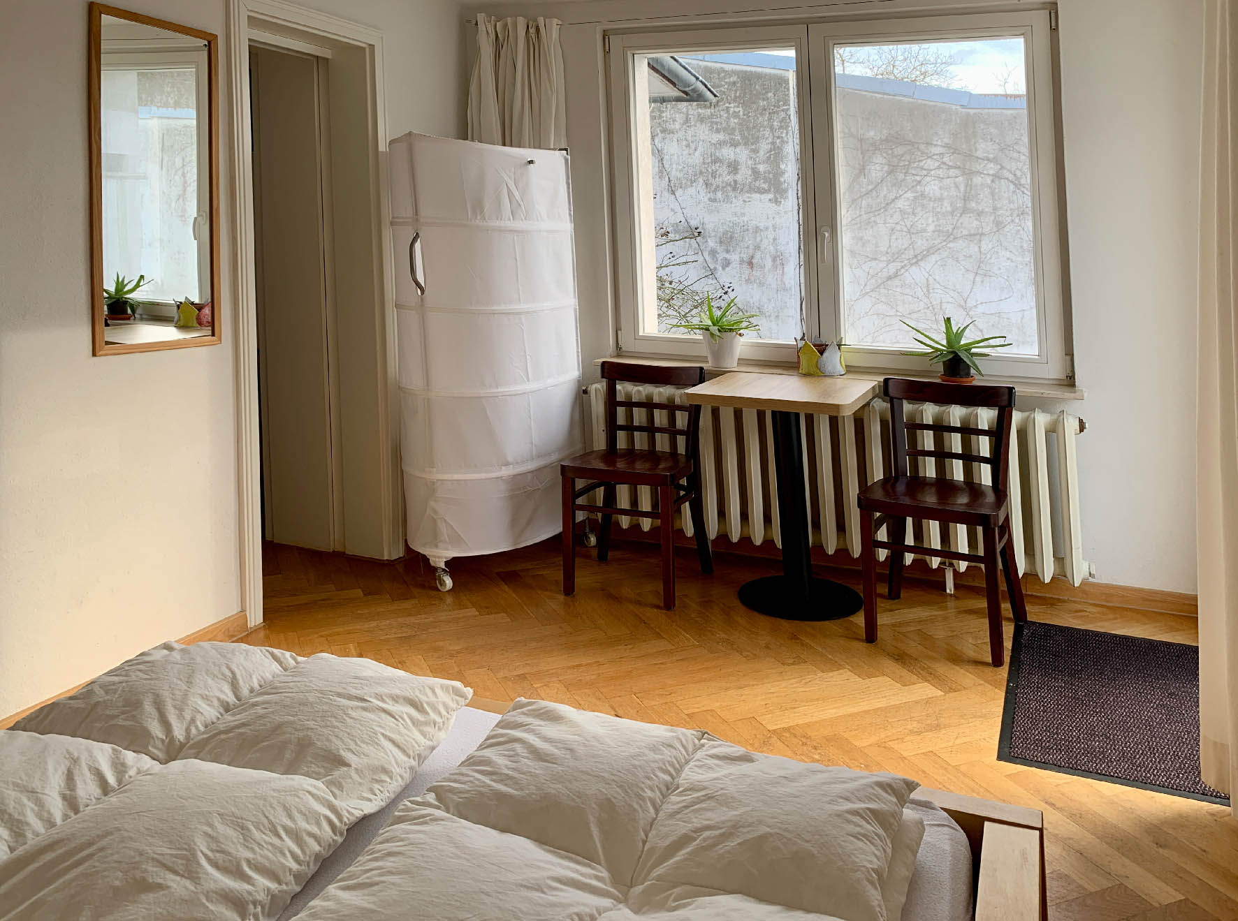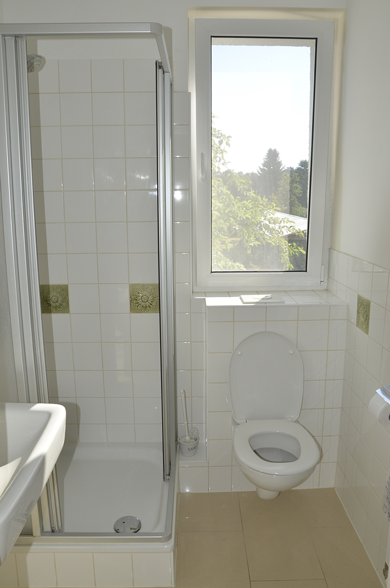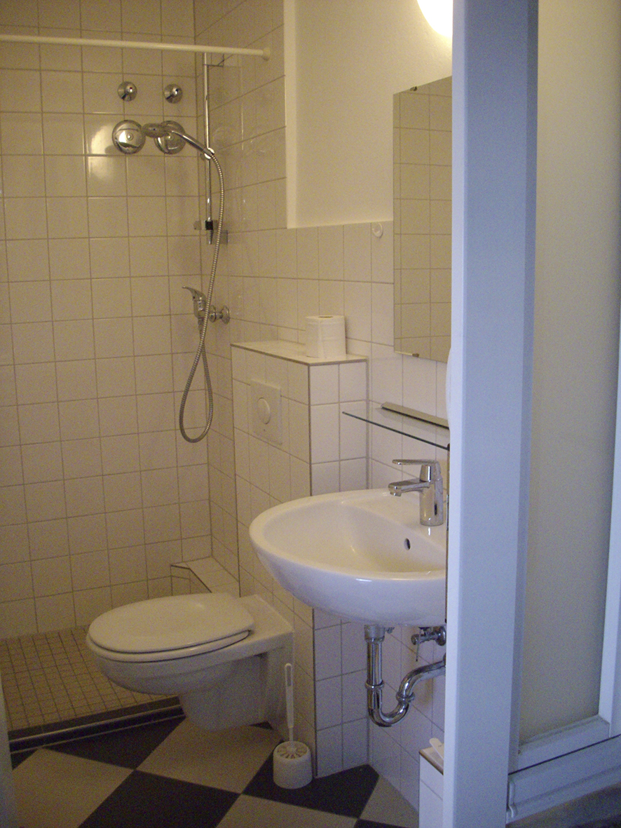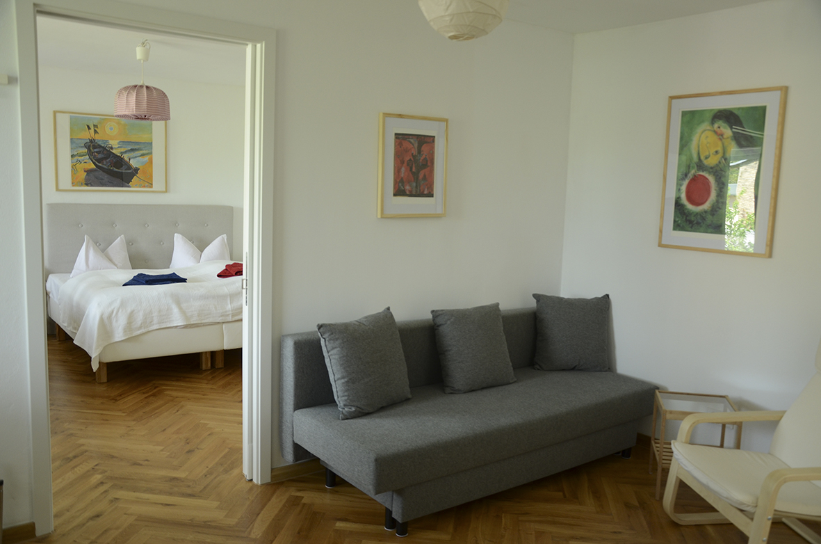 The „Courtyard Balcony Room“ (Hofbalkonzimmer) and the "Lake View Rooms" are located on the upper floor, with shared kitchen and bathroom, and has a private balcony to enjoy the morning sun overlooking the courtyard. It has two beds and a bunk bed (mattress : 90 cm x 2 m).