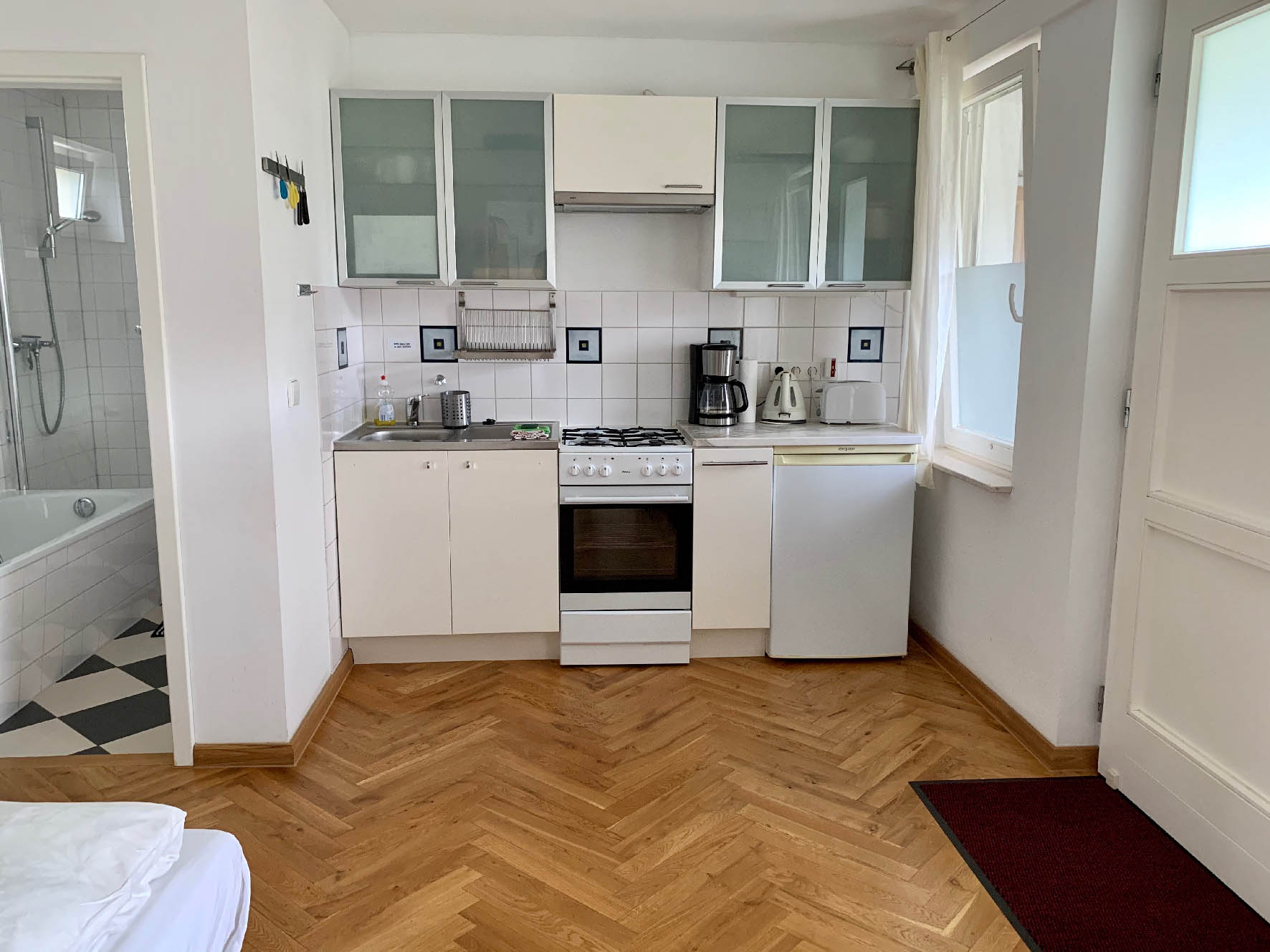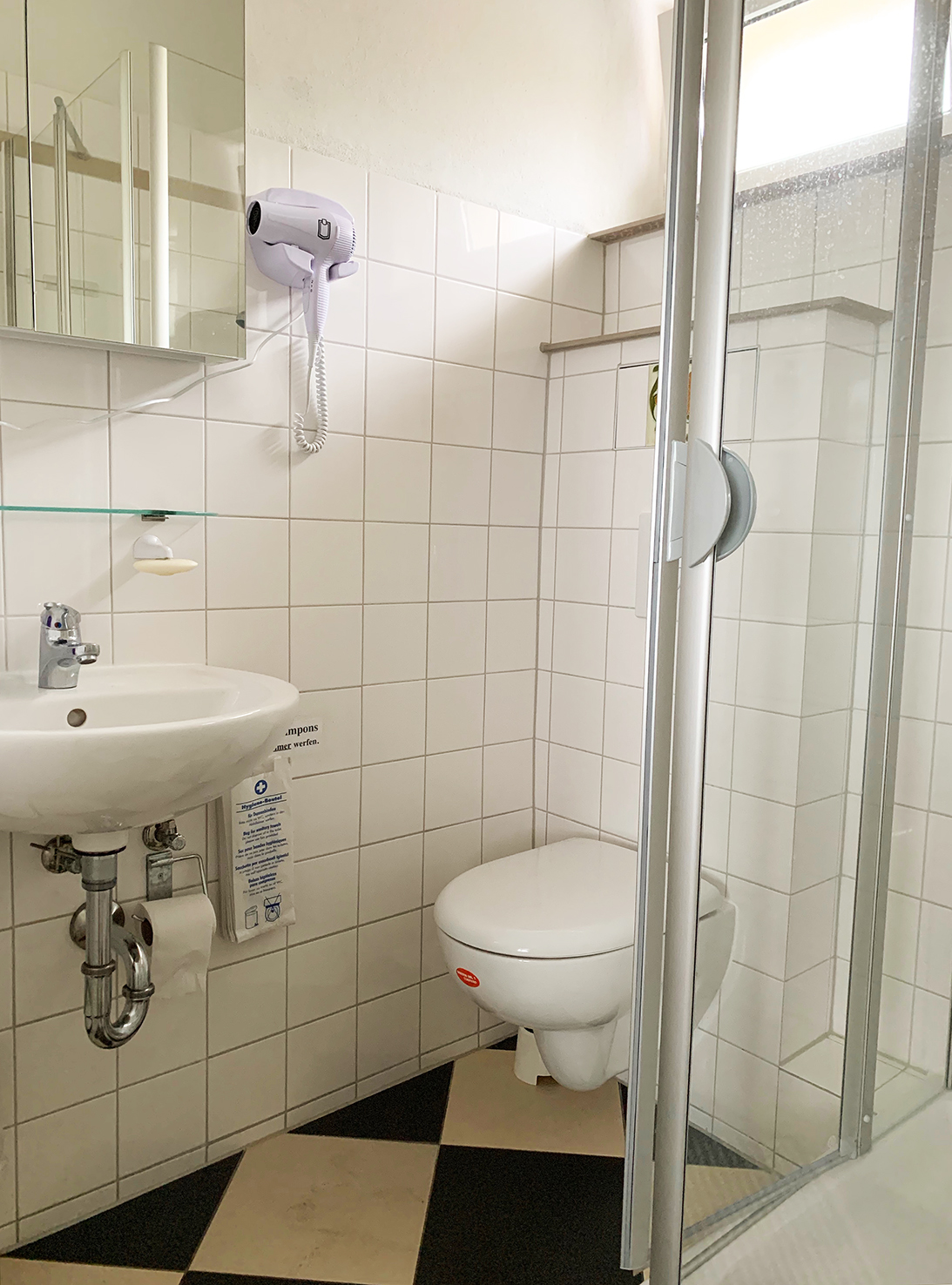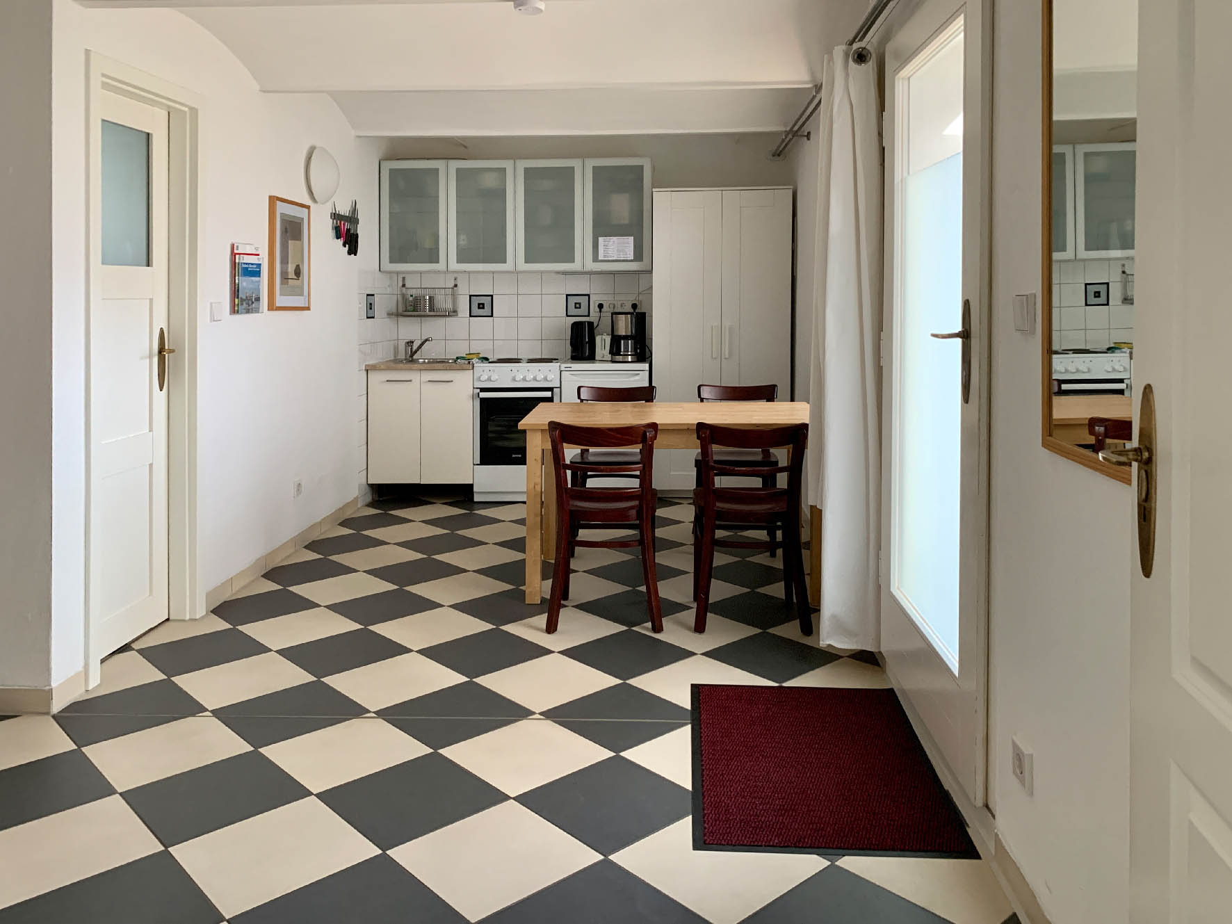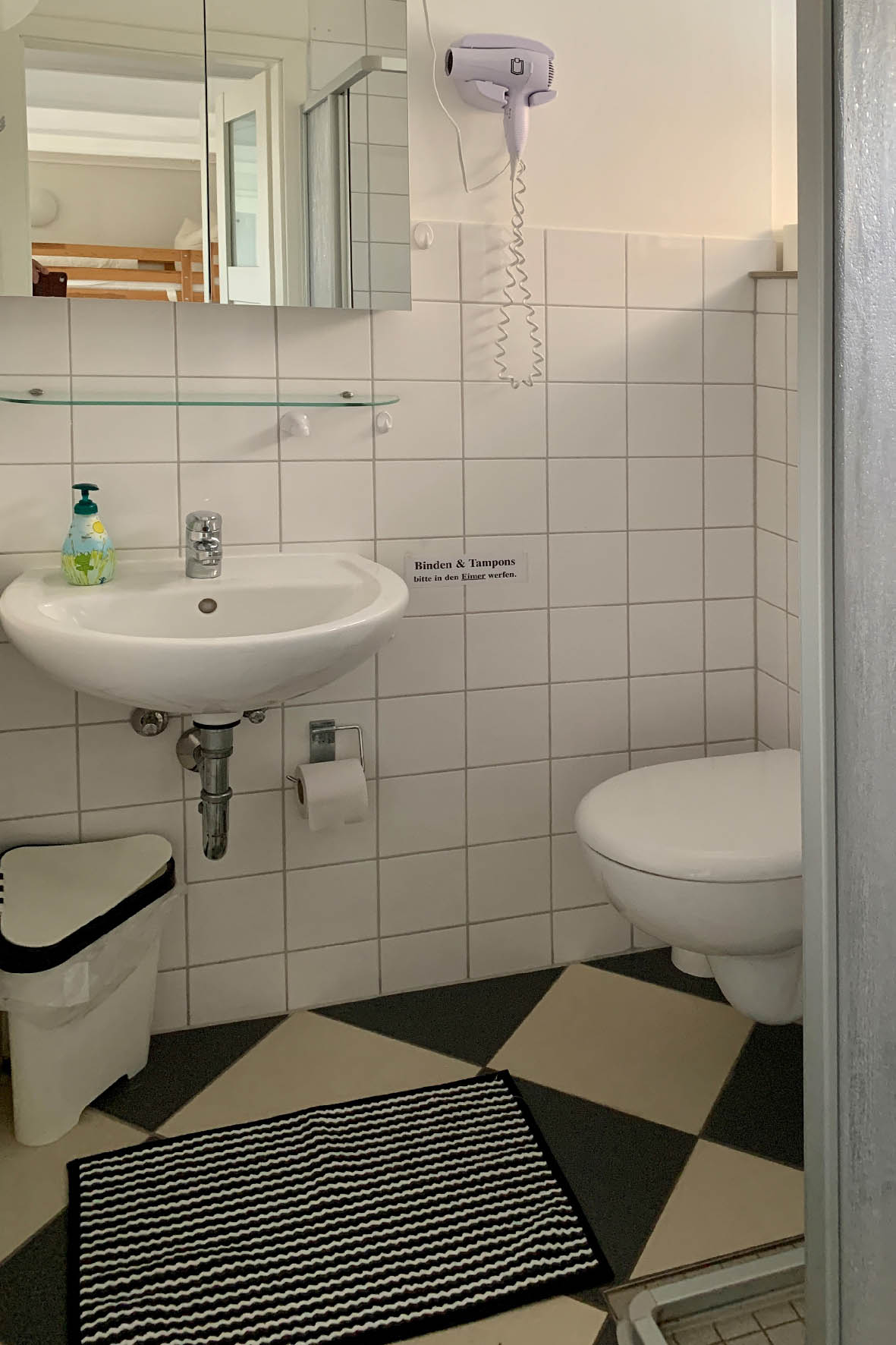 The „Courtyard Balcony Room“ (Hofbalkonzimmer) and the "Lake View Rooms" are located on the upper floor, with shared kitchen and bathroom, and has a private balcony to enjoy the morning sun overlooking the courtyard. It has two beds and a bunk bed (mattress : 90 cm x 2 m).